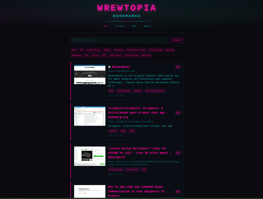 For a long while I've wanted a bookmarks manager, but it's been a lower priority project. I had at one point attempted to set up stuff like Shaarli, but ran into a lot of issues and pain points during the initial setup that I ultimately abandoned it and never went back. I realized recently that I'd never finished the project, and then remembered why, and so decided that I'd just build my own so I could have the features I wanted and not have to deal with the headache of managing Shaarli (assuming I ever got it to run).