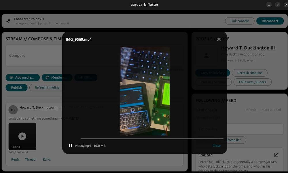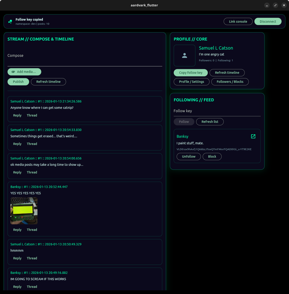 Aardvark Social is a proof of concept social media app built on Veilid. While it was initially conceived as a technology demonstrator, it quickly became clear it could actually do well as an app in it's own right and development continued on it beyond it's initial scope.